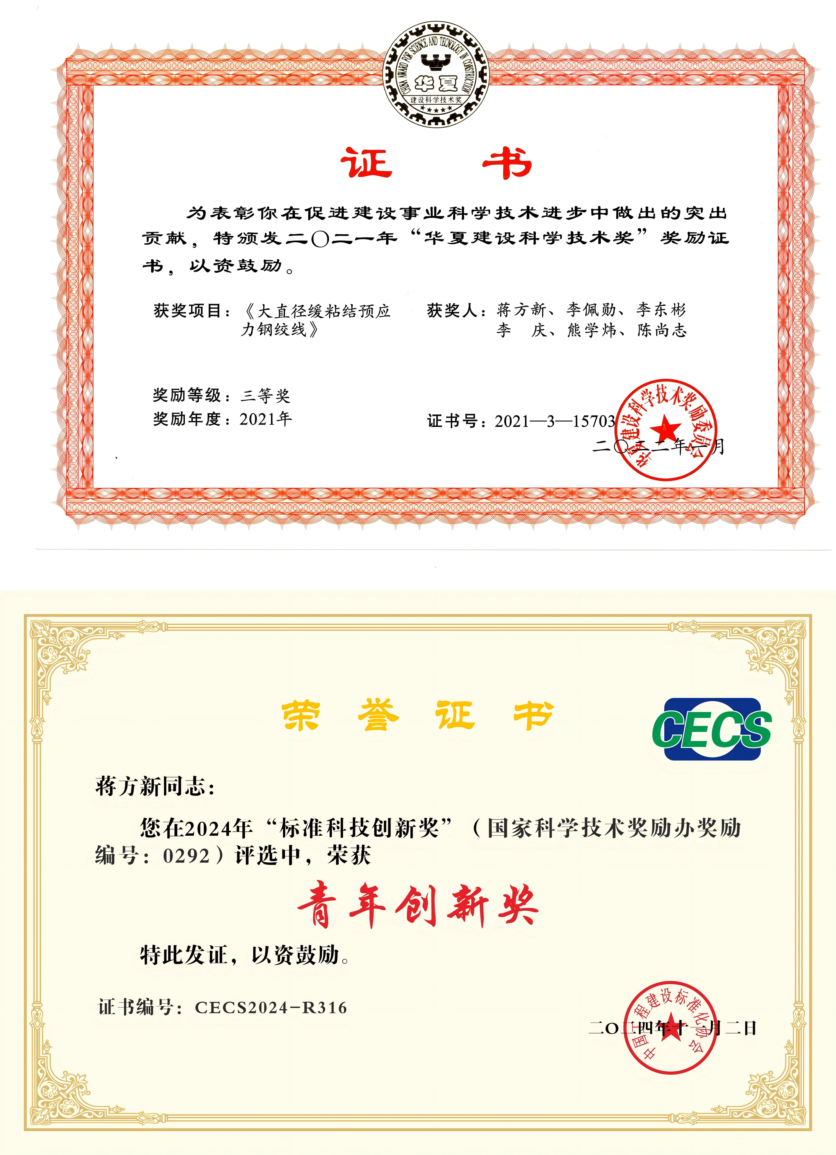 蔣方新帶領(lǐng)團(tuán)隊(duì)成功研發(fā)大直徑緩粘結(jié)預(yù)應(yīng)力材料、濕氣型緩粘結(jié)預(yù)應(yīng)力材料、高粘抗?jié)B緩粘結(jié)預(yù)應(yīng)力材料、緩粘結(jié)預(yù)應(yīng)力錨桿及超高強(qiáng)預(yù)應(yīng)力材料,并成功開發(fā)配套錨具及張拉機(jī)具設(shè)備等。所研發(fā)新型預(yù)應(yīng)力材料形成了完備的技術(shù)體系,處于國內(nèi)領(lǐng)先、國際先進(jìn)水平,相關(guān)產(chǎn)品取得北京市新技術(shù)新產(chǎn)品認(rèn)證。