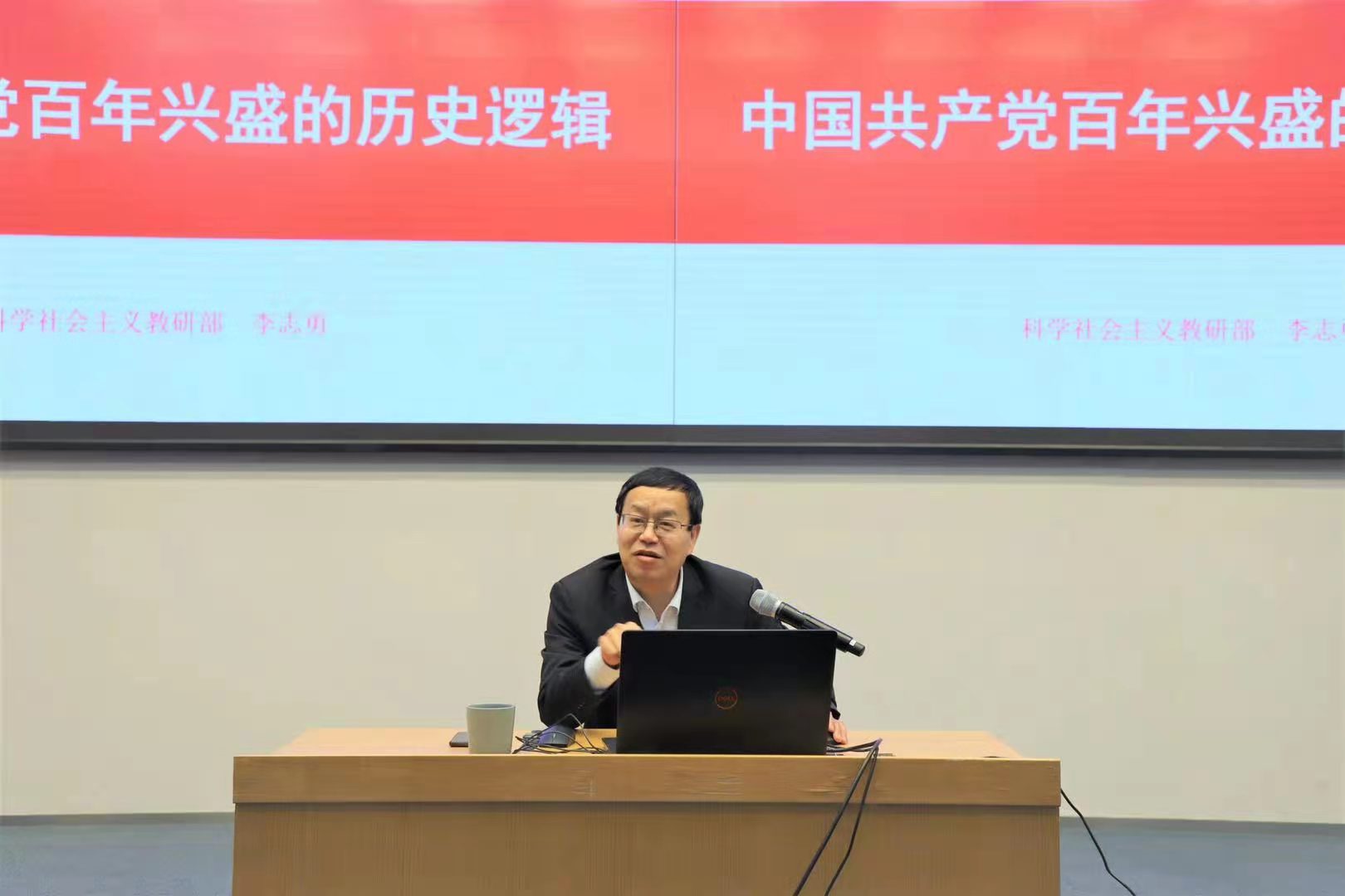 李志勇教授從初心使命、光輝歷程、偉大成就和歷史經(jīng)驗四個方面引導大家一同回顧了中國共產(chǎn)黨成立以來的崢嶸歲月。在對歷史經(jīng)驗的講授中,李教授分別從思想一變天地寬、勇立潮頭敢為先、得民心者得天下、自我革命御風險、紅色基因不能變和團結(jié)統(tǒng)一鑄輝煌六個方面,闡明了中國共產(chǎn)黨能夠帶領(lǐng)中國人民從站起來、富起來到強起來的深刻原因,充分論證了中國特色社會主義制度的優(yōu)越性和道路的必然性。