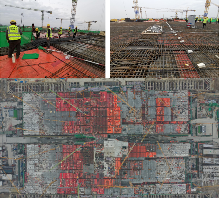 高鐵杭州西站是中國特大型鐵路樞紐站房之一,是集鐵路、軌道交通、長途客運、地鐵、公交、出租及社會車輛等多種交通于一體的“大型綜合交通樞紐”,是國內(nèi)第一個付諸實施的“站城融合”特大型高鐵樞紐,是新時代高鐵樞紐站城融合的標桿。工程總建筑面積約74萬平米,其中預(yù)應(yīng)力工程量約9000多噸,是目前國內(nèi)預(yù)應(yīng)力工程量最大的高鐵站房。其結(jié)構(gòu)復(fù)雜,承軌層采用預(yù)應(yīng)力箱梁+鋼管柱結(jié)構(gòu)方案;施工難度大,鋼結(jié)構(gòu)、預(yù)應(yīng)力、主體鋼筋等工序同步穿插進行;工期緊,主體結(jié)構(gòu)工期僅10個月。預(yù)應(yīng)力類型多,既采用了傳統(tǒng)有粘結(jié)預(yù)應(yīng)力技術(shù),亦采用了我單位自主研發(fā)的大直徑緩粘結(jié)預(yù)應(yīng)力技術(shù)。