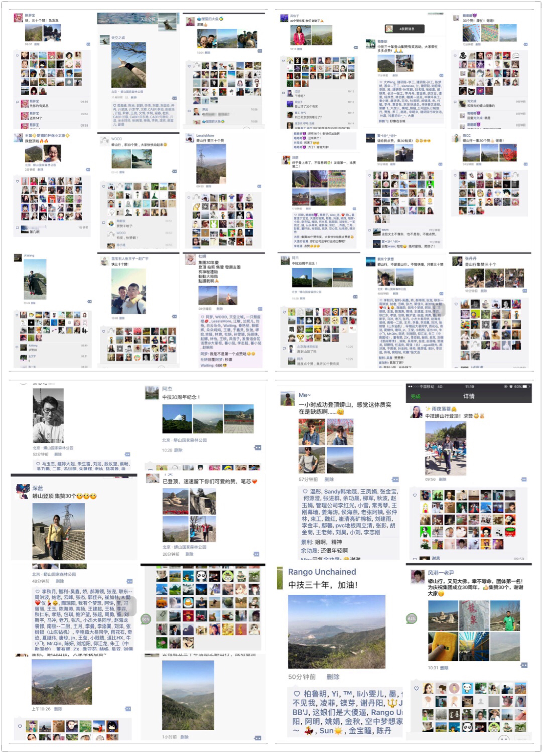 春季登山比賽早已作為中技集團(tuán)工會(huì)一年一屆的經(jīng)典活動(dòng),在這次活動(dòng)中,主辦方為配合公司成立三十周年加入了一個(gè)創(chuàng)新的小游戲,即登頂前三十人發(fā)朋友圈集齊30個(gè)贊后有一份神秘奬。