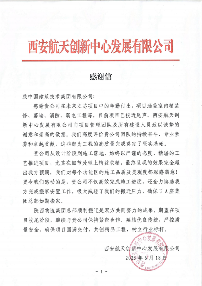 近日,中國建技收到西安航天創(chuàng)新中心發(fā)展有限公司(以下簡稱“西安航發(fā)”)發(fā)來的感謝信。對中國建技在西安“未來之芯”項目團(tuán)隊展現(xiàn)出的專業(yè)素養(yǎng)、高效協(xié)作以及卓越的項目管理能力給予高度贊揚(yáng)。
