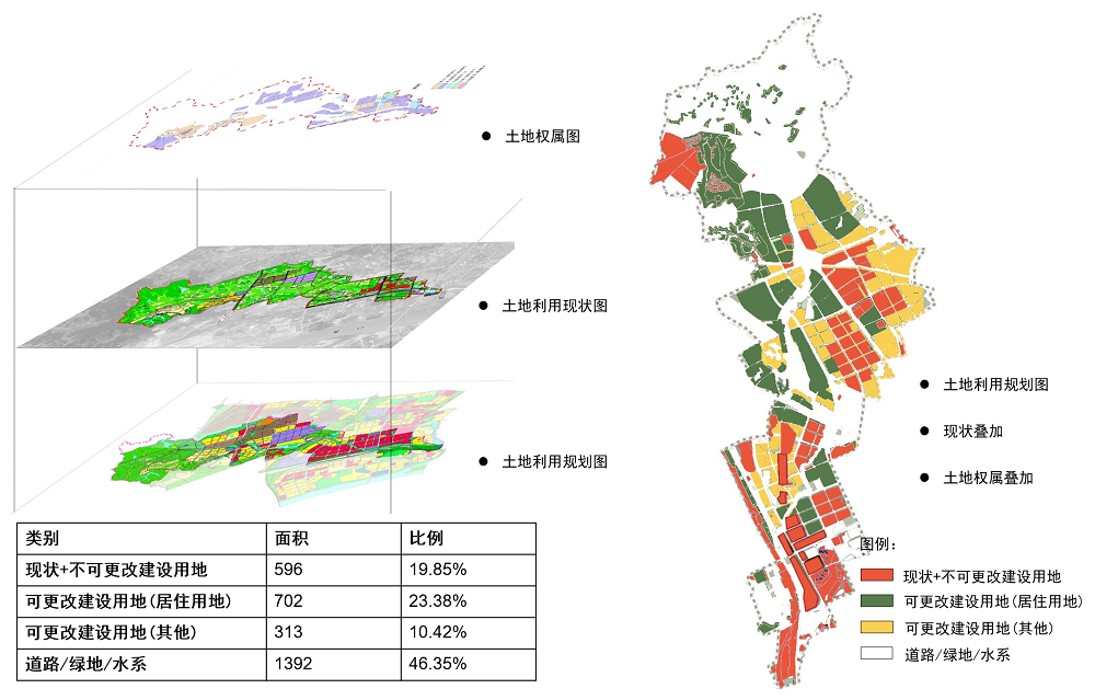 2.?土地情況梳理——對土地利用現(xiàn)狀情況、權屬情況、規(guī)劃情況進行三者疊加,結合產(chǎn)業(yè)發(fā)展方向及文化景點策劃,梳理水系及考慮產(chǎn)城配套,局部調(diào)整用地性質(zhì)。