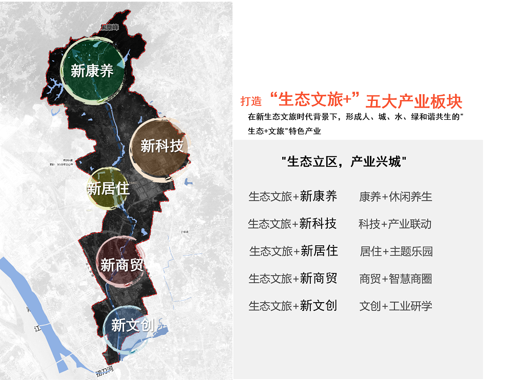 3.?產(chǎn)業(yè)布局策劃——在新生態(tài)文旅時代背景下,形成人、城、水、綠和諧共生的"生態(tài)+文旅"特色產(chǎn)業(yè),打造“生態(tài)文旅+” 五大產(chǎn)業(yè)板塊,即生態(tài)文旅+新康養(yǎng)、生態(tài)文旅+新科技、生態(tài)文旅+新居住、生態(tài)文旅+新商貿(mào)、生態(tài)文旅+新文創(chuàng)。