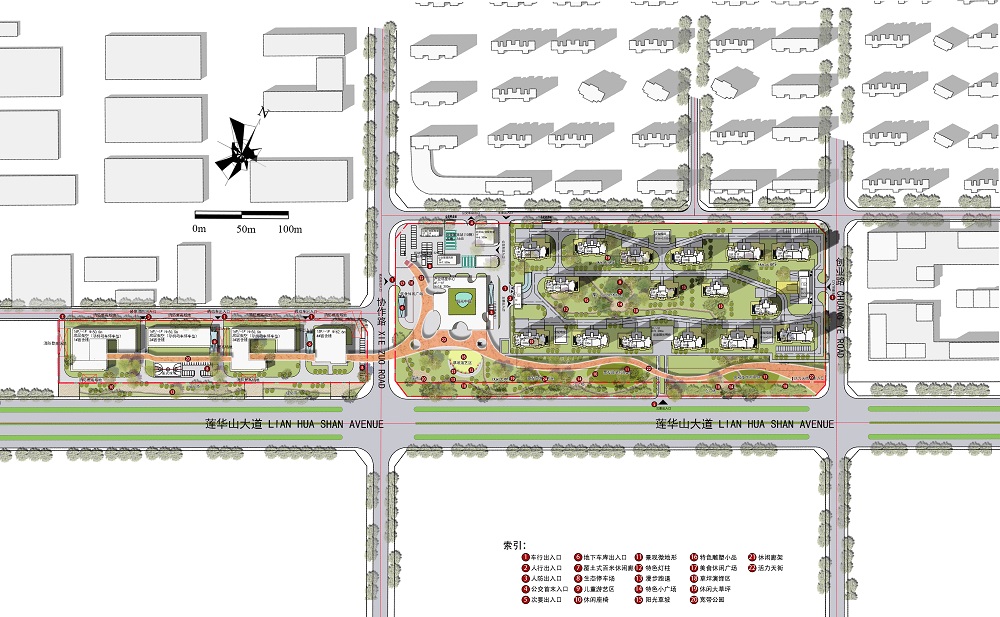通過調(diào)研分析,提出【都市綠洲、活力天街、靈動(dòng)空間】三個(gè)設(shè)計(jì)理念,著力打造五大特色場(chǎng)景: