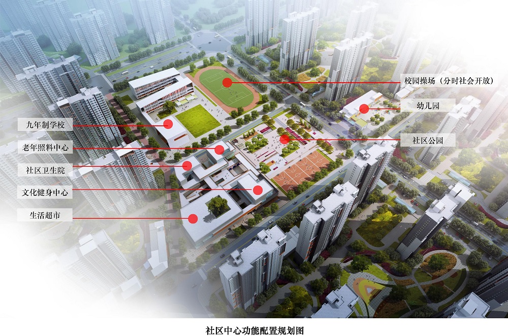 將生活超市、文化娛樂、全民健身、社區(qū)醫(yī)療、老年照料、九年制學(xué)校、社區(qū)公園、幼兒園和管理服務(wù)等社區(qū)類級(jí)的公共設(shè)施相對(duì)集中或鄰近布局,實(shí)現(xiàn)了便利化使用和規(guī)?;?jīng)營(yíng)的雙重目標(biāo)。規(guī)劃同時(shí)兼顧設(shè)施抗擾和共享平衡的問題:醫(yī)療、養(yǎng)老相互結(jié)合,教學(xué)設(shè)施相對(duì)獨(dú)立,學(xué)校操場(chǎng)臨近社區(qū)公園和文體中心布置,方便對(duì)外開放和聯(lián)動(dòng)使用。