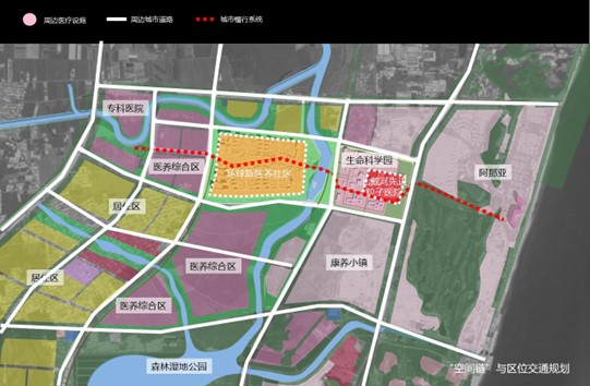 本項規(guī)劃以產(chǎn)業(yè)功能布局的需求為基礎(chǔ),試圖通過“空間鏈”的規(guī)劃方法,將本規(guī)劃區(qū)納入核心區(qū)大醫(yī)養(yǎng)功能區(qū)中,形成開放的城市空間系統(tǒng),通過交通、景觀及區(qū)劃融合的方式,促進本醫(yī)養(yǎng)社區(qū)與生命科學(xué)園、周邊醫(yī)養(yǎng)綜合區(qū)、濱海度假區(qū)之間的空間聯(lián)系和產(chǎn)業(yè)互動。