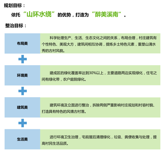 規(guī)劃目標(biāo):依托“山環(huán)水繞”的優(yōu)勢(shì),打造“醉美溪南”。整治目標(biāo):建設(shè)“布局美、環(huán)境美、建筑美、生活美”的“四美”溪南。