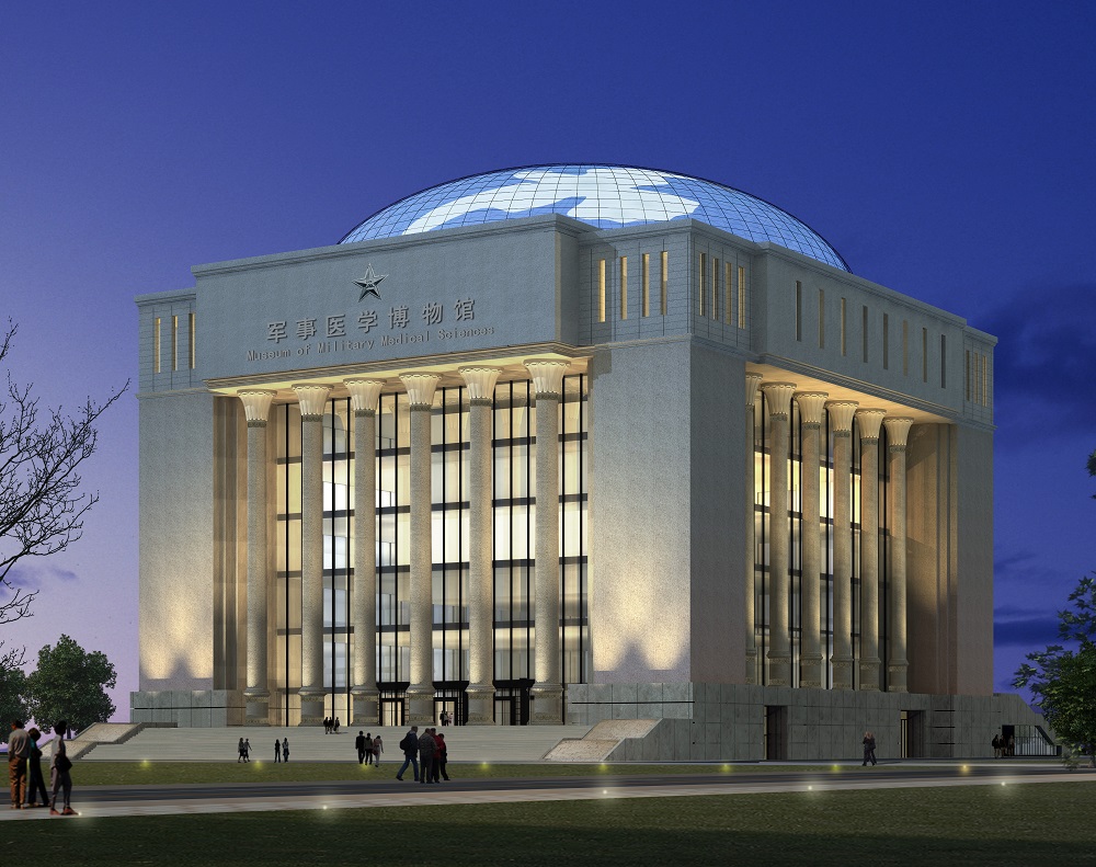 中國人民解放軍軍事醫(yī)學(xué)博物館位于北京市海淀區(qū)太平路,軍事醫(yī)學(xué)研究院內(nèi)西南角,是一座國家級大型軍事醫(yī)學(xué)類博物館。建筑用地0.873公頃,總建筑面積38000平方米。主體建筑方正,頂部圓形玻璃穹頂直徑47米,表達了天圓地方的中國文化理念。穹頂玻璃幕結(jié)合太陽能技術(shù),部分太陽能反射板組成和平鴿圖案,寓意世界和平,表達了設(shè)計的主題。