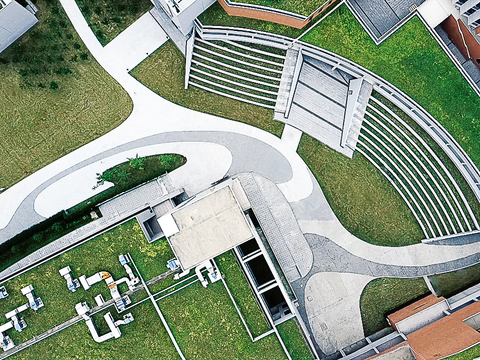 浦江源應是如水一樣的校園,有分有聚,并具備很強的流動性,故在規(guī)劃理念上,我們運用流動的景觀創(chuàng)造獨特而豐富的空間體驗,流動的景觀同建筑完美的結合在一起,共同形成上戲浦江源。浦江校園內具有大量的演藝空間,放映廳,排練廳,室外劇場等,這些空間賦予這座校園最強烈的性格——一個綜合的實訓中心,我們考慮將這些空間設計成一個互相聯(lián)系的網(wǎng)絡,這個系統(tǒng)具備便捷的流線連接,呼應的視線連接,以及和室外景觀的結合,共同匯聚成浦江源。基于對所需建筑功能的分析,我們將建筑進行了重新組合,將電視電影學院和圖文信息中心合并成一個學院綜合體,同實訓中心相連。將體育運動中心、食堂與學生教工公寓合并形成師生的生活組團。將行政樓、創(chuàng)意學院與基礎教學樓組合形成學校的教學實驗區(qū)。